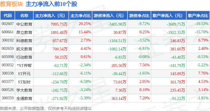 从资金流向上来看,当日教育板块主力资金净流入1311.95万元,游资资金净流出1683.35万元,散户资金净流入371.4万元。教育板块个股资金流向见下表: