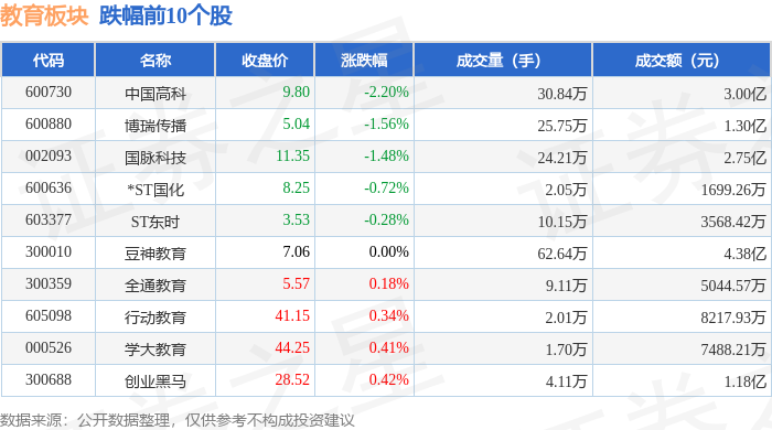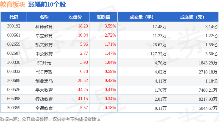 证券之星消息,10月27日教育板块较上一交易日上涨0.25%,科德教育领涨。当日上证指数报收于3996.94,上涨1.18%。深证成指报收于13489.4,上涨1.51%。教育板块个股涨跌见下表: